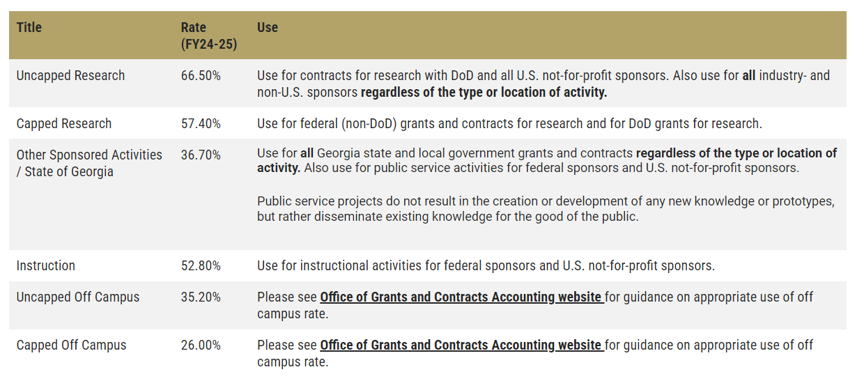 This article highlights the different F&A rates applicable to sponsored activity at Georgia Tech. Please see the August 2022 PI Article for background on F&A, the components of the calculation, how rates are negotiated, etc.